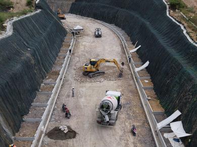 Adapun jenis pekerjaan yang saat ini tengah dilaksanakan di lapangan meliputi galian pada tebing, pemasangan matras tipe III dan penanaman vegetasi, soil nailing, pemasangan jaring kawat berkekuatan tinggi, pekerjaan saluran perimeter, serta saluran U tipe DS 3.